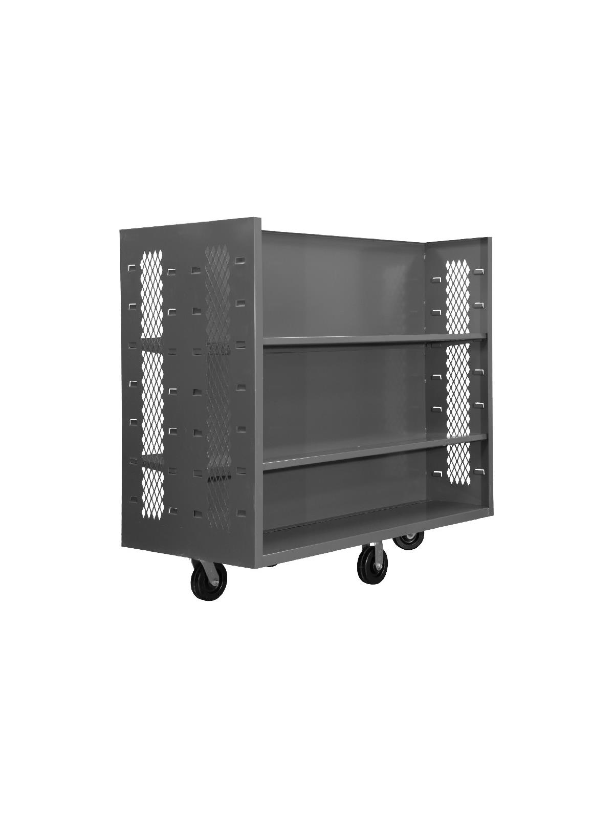 Features 2 sided design for greater efficiency and see-through mesh sides. All units are 48" above the deck. Center panel makes it easy to see on-board items. 2000 lb. model rolls on 6" phenolic casters: 2 rigid, 2 swivel.  Durable Gray powder coat finish. FOB Shipping Point.